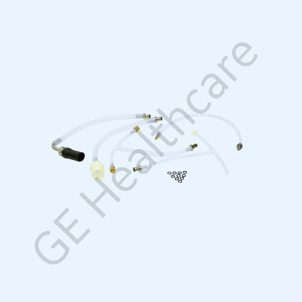 The Low Pressure Fitting Kit is a part used in Anesthesia Delivery. It contains O-rings for cpc connector pkg of 10 07308-00, syringe 20cc llk vari-stop sterile 8881-520186, cpc tee mxf 1/8IN barb fitting, cpc connector 1/4IN barb mc22-04 and silicon tubing 1/4IN ID. The cpc connector 1/4IN barb MC22-04 with stainless steel fitting and injection molded polypropylene barb fitting at both ends of the tube. The tube has a good bending radius and can be easily fixed to the Patient Monitoring system. The insulation tube is calibrated during production to achieve high reliability. The tube material has excellent chemical resistance, which makes it well suited for many medical applications. The GE product is an innovation and technology which fits well into versatile customer needs. It is manufactured using high precision techniques which helps to achieve a good surface finish as well as good product consistency. The part is diligently designed for high performance and reliability. It is securely packaged inside a high quality packing box to avoid physical damage during transit and labeled with details about the product, Quality Assurance (QA) seal and shipment details.
